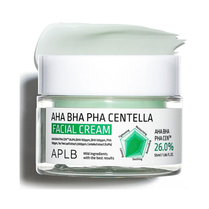 Restore clarity, calmness, and smoothness to your skin with APLB AHA BHA PHA Centella Facial Cream, a multi-functional moisturizer that gently exfoliates while deeply hydrating and soothing sensitive skin. Powered by a unique blend of AHA, BHA, and PHA, this cream promotes gentle yet effective exfoliation — helping to clear clogged pores, remove dead skin cells, and smooth rough texture.
